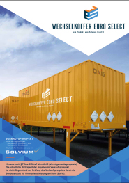 Solvium Capital öffnet als einer der erster Anbieter die Assetklasse der Wechselkoffer. Die Vermögensanlage bietet Anlegern den Kauf bereits an Logistikunternehmen aus dem deutschsprachigen Raum vermieteter Wechselkoffer mit attraktivem Cashflow an. Verwaltet und vermietet werden die Wechselkoffer von Solviums Partner Axis Intermodal Deutschland GmbH aus Köln. Das Unternehmen ist seit einigen Jahren Marktführer für die Vermietung von Wechselkoffern in Europa. Rund 80 Millionen Euro hat Axis in den vergangenen Jahren gemeinsam mit seinen Investoren durch Direktinvestments in den kontinuierlichen Ausbau der Flotte investiert. Damit managt Axis fast 90 Prozent aller bisherigen Wechselkoffer-Direktinvestments in Deutschland. Die Flotte von über 13.000 Einheiten soll in den kommenden Jahren weiter kräftig ausgebaut werden.